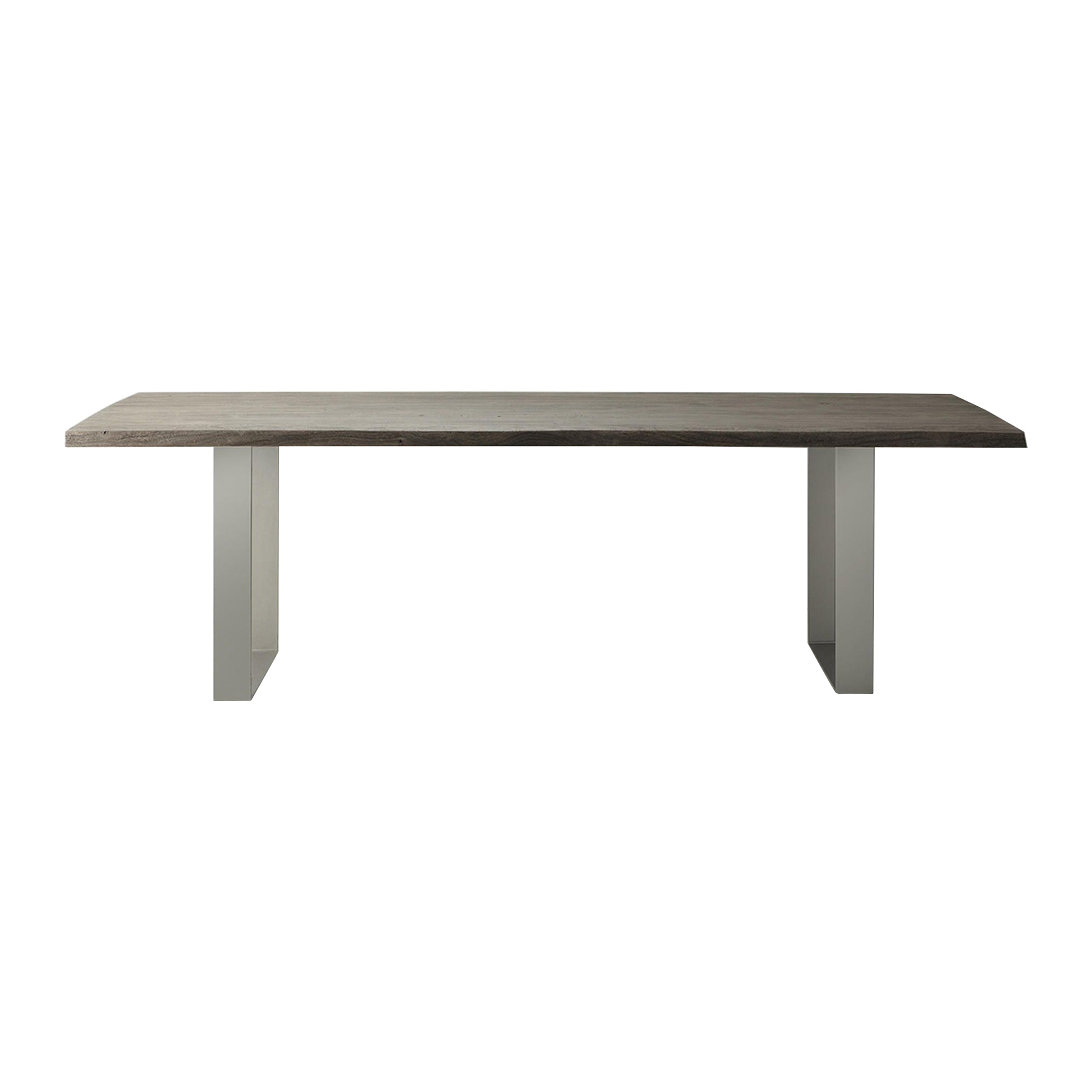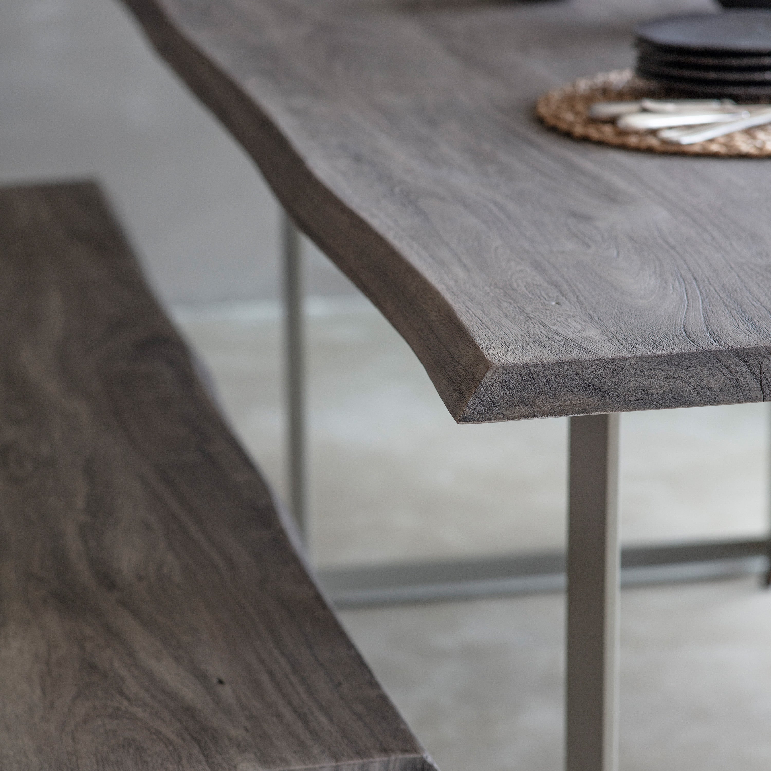A modern twist on a timeless look. This Batesville range is a beautiful addition to your living space. Made with a solid Acacia wood top featuring a beautiful and unique waney edge and finished with silver poder coated iron legs.