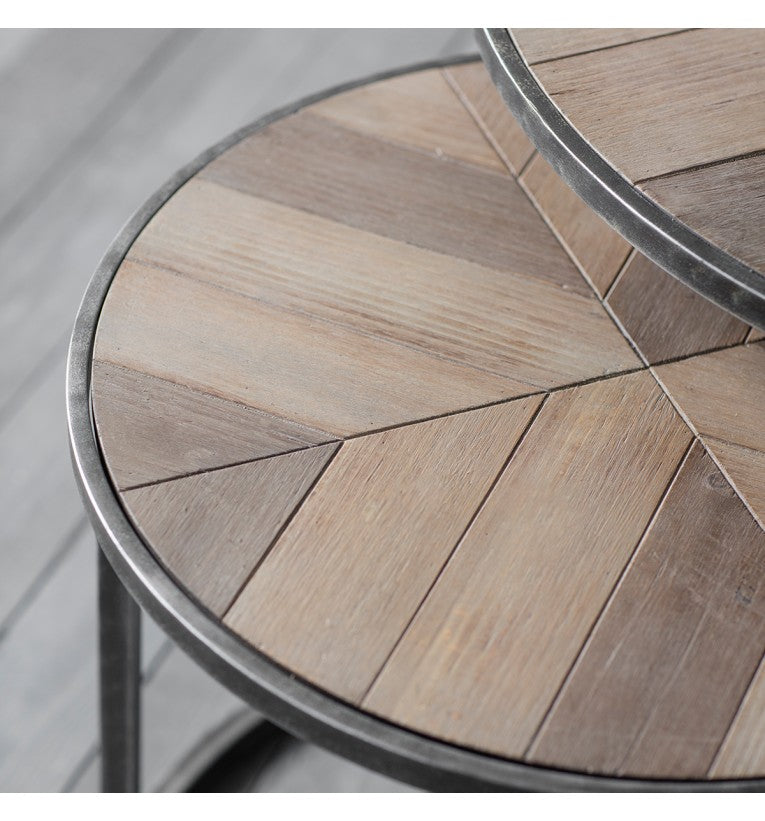 This functional nest of 2 tables features a chevron effect weathered timber inlaid top and gun-metal metallic base that suits any interior with nod towards industrial and eclectic design.