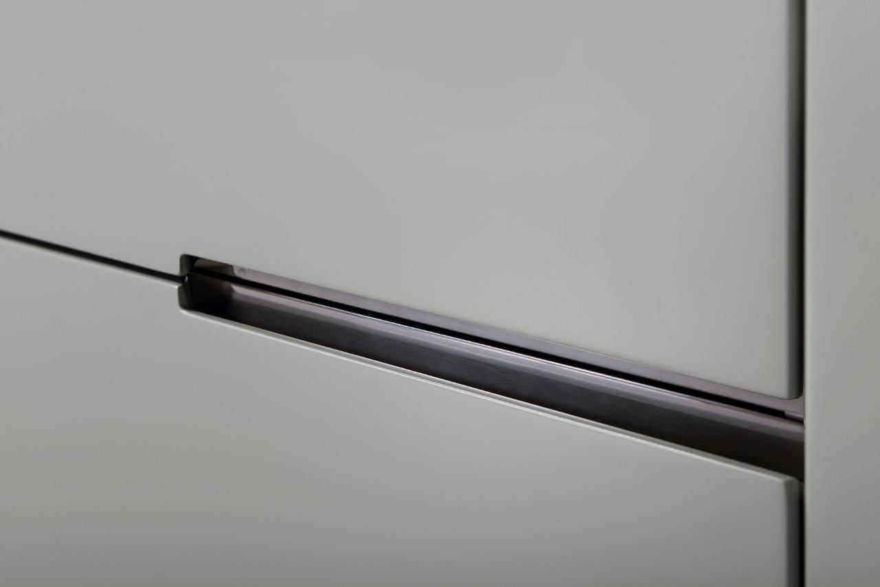 A door & drawer combination sideboard in grey with dark chrome frame and accents
