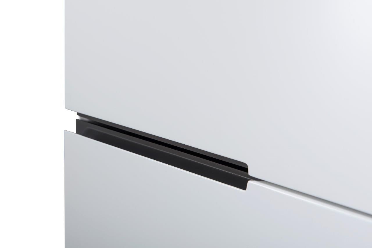 A six drawer tall narrow chest in white with dark chrome frame and accents