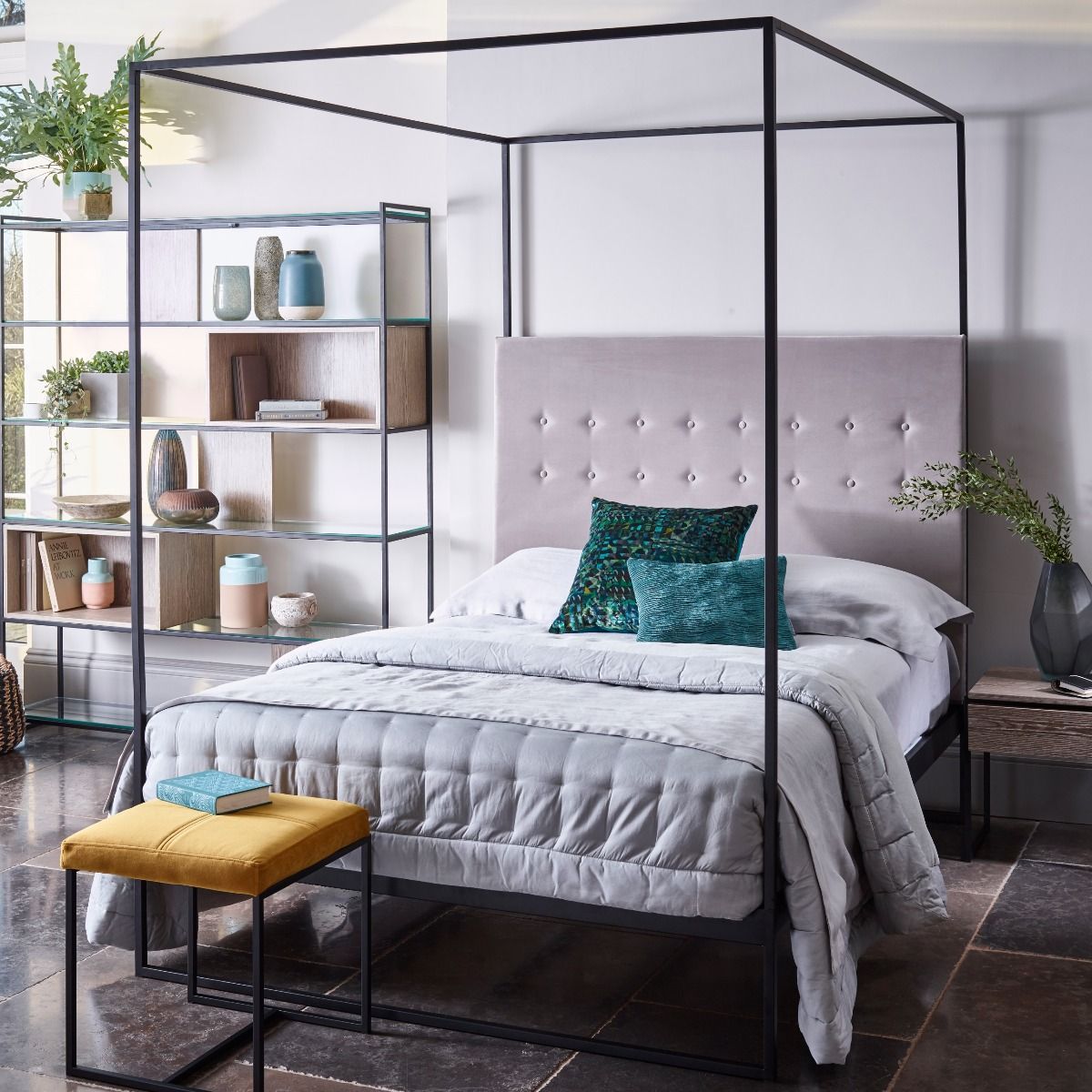 A sleek and gorgeous addition for your contemporary bedroom style, designed with an upholstered grey velvet fabric, and finished with a golden frame.