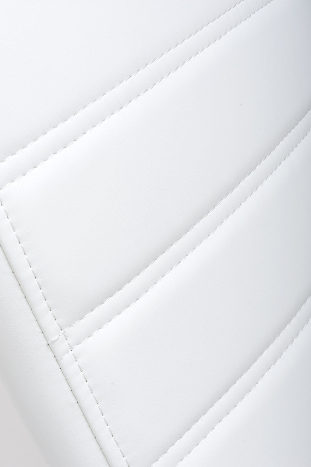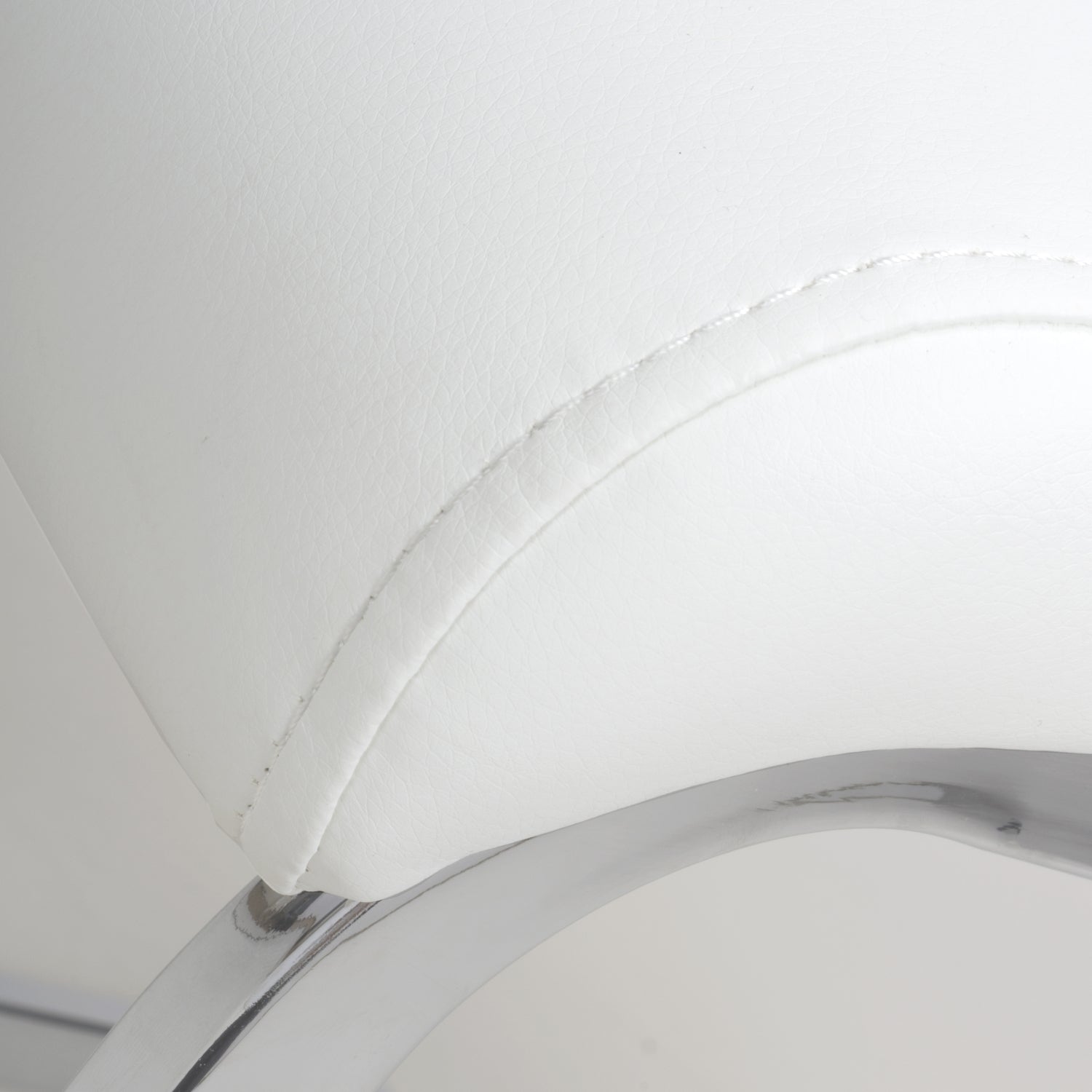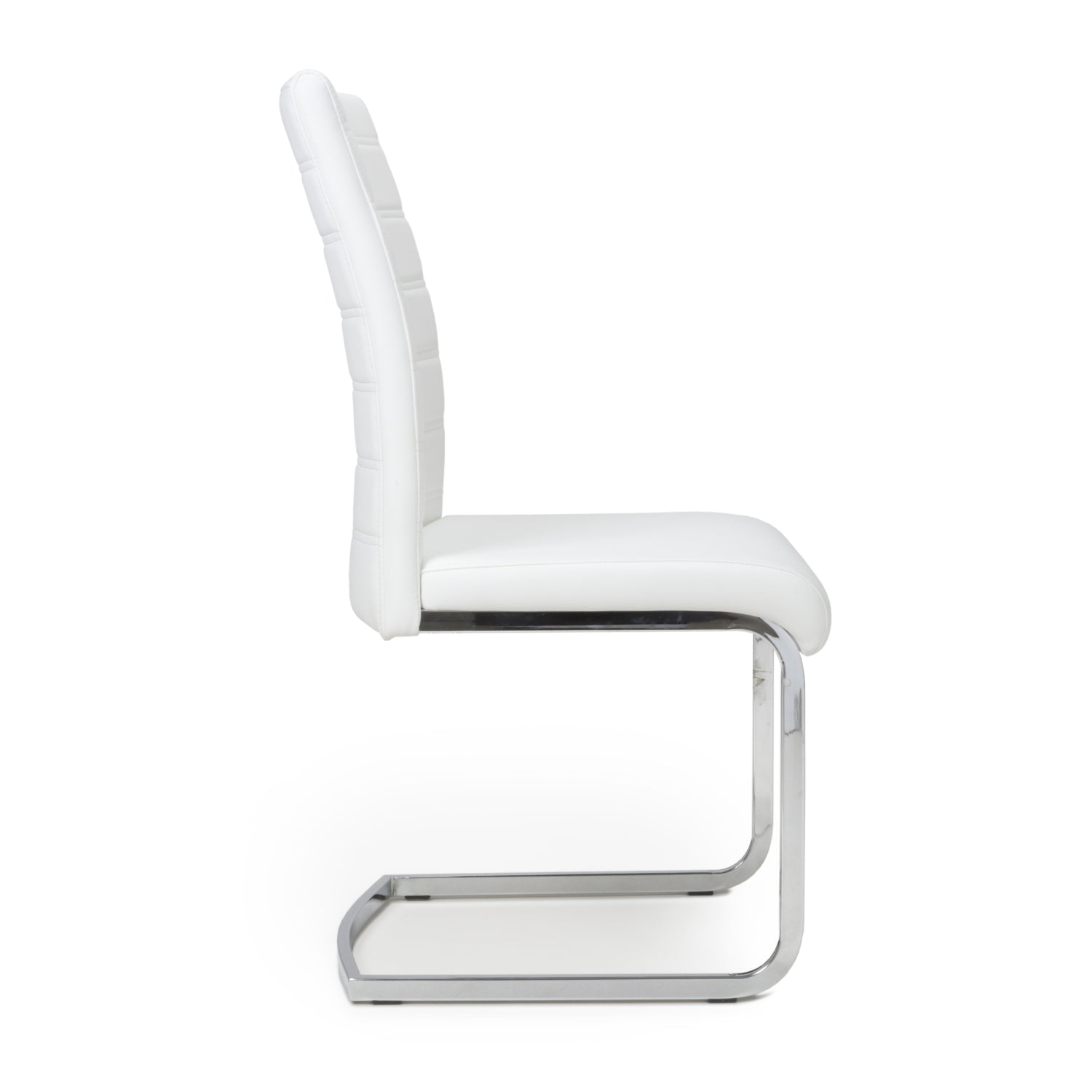 A clean line curved back cantilever chair, upholstered in a white leather match. Segmented horizontal paneled stitching. Fitted with grey metal cantilever legs.