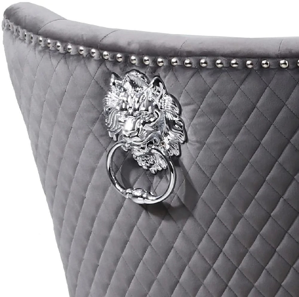 An impeccably designed wing back accent chair featuring a stunning chrome lion's head ring. Upholstered in luxurious grey brushed velvet with a tufted button front. Fetching diamond stitched back and sides are highlighted by wraparound stud detailing.