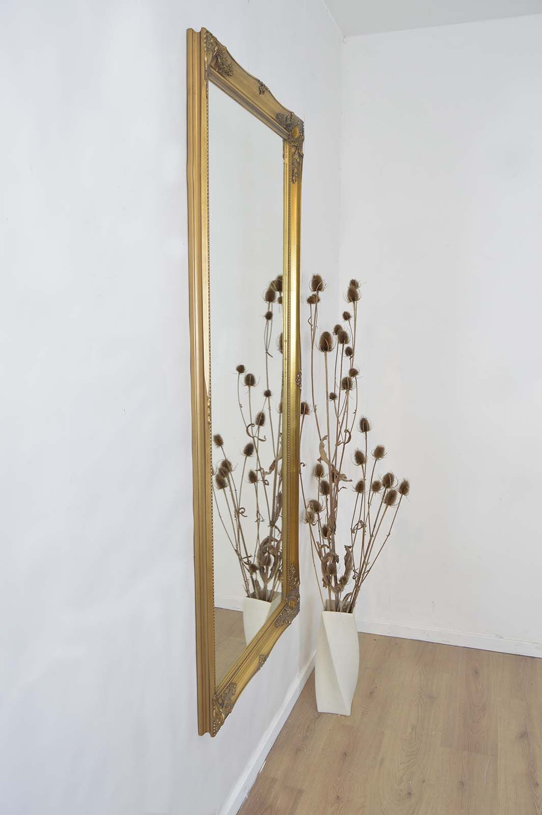 A classic gold hand finished French style frame. The design boasts ornate detailing in all four corners and sides beaming elegance through any surrounding. This mirror has a glass size of 5ft x 2ft 153cm x 61cm and has an overall size of 5ft 6 x 2ft 6 167cm x 76cm. We stock this frame in 5 different colours white gold black silver and ivory and 11 different sizes 76cm x 56cm to 167cm x 106cm.