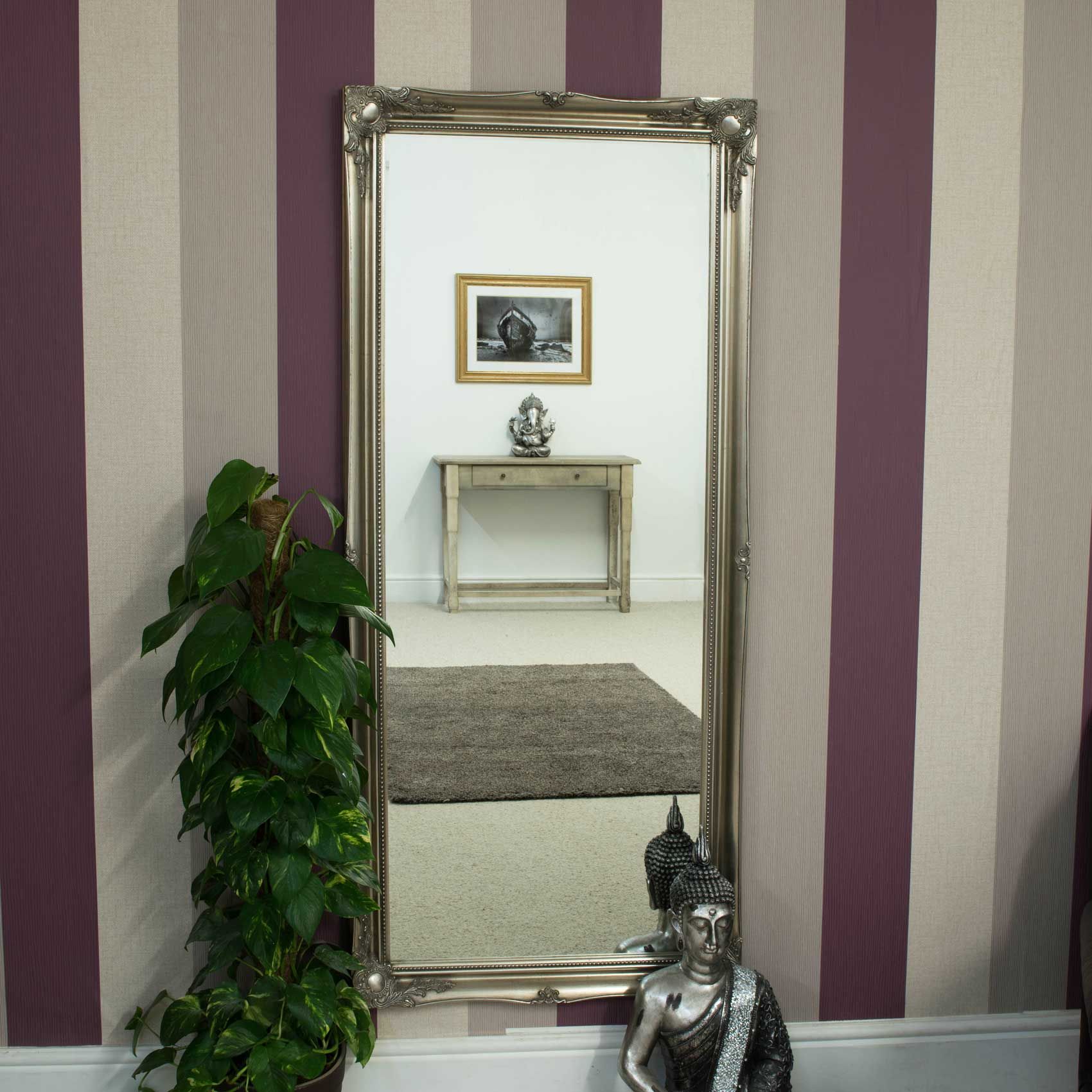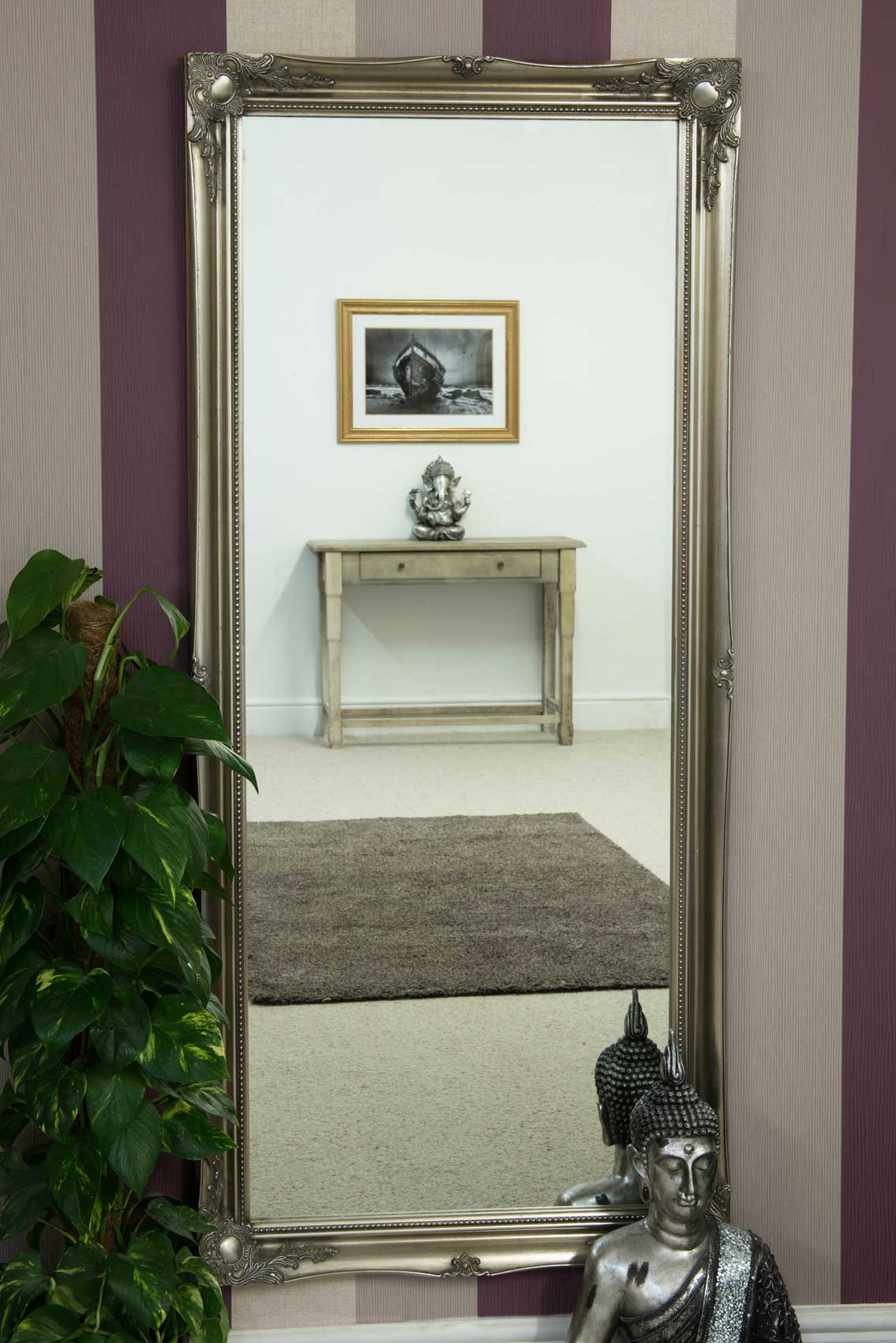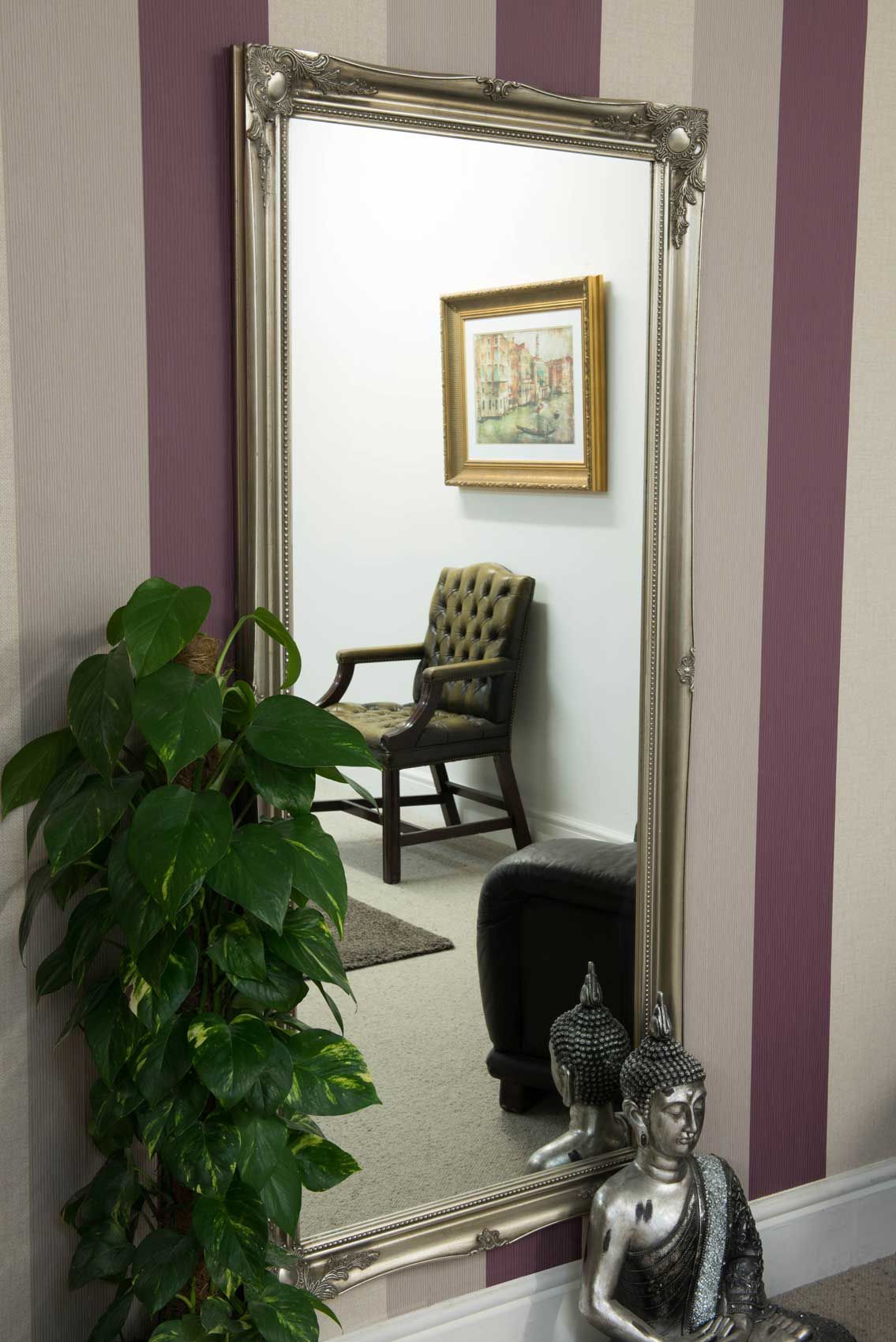 A classic champagne silver hand finished French style frame. The design boasts ornate detailing on all four corners and sides. This mirror has a glass size of 5ft x 2ft 153cm x 61cm and has an overall size of 5ft 6 x 2ft 6 167cm x 76cm. We stock this frame in 5 different colours black white champagne silver gold and ivory and 11 different sizes 76cm x 56cm to 167cm x 106cm.
