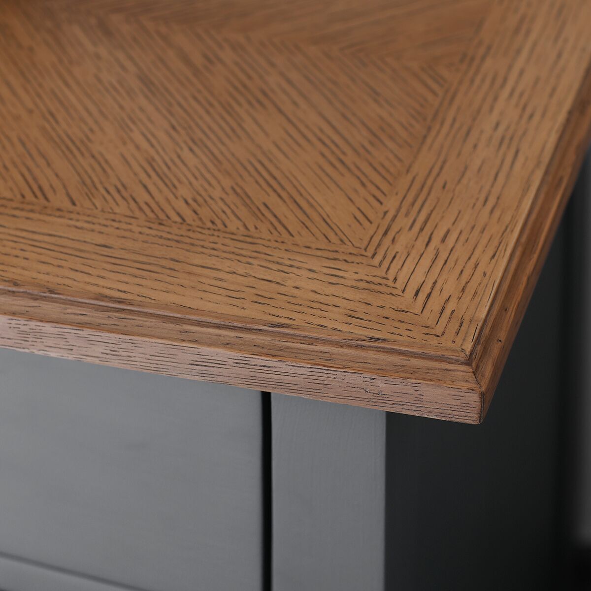 The Bashaw 3 Door 2 Drawer Sideboard in Storm offers a classic look with a twist. The range is made using painted mahogany solids, complimented by quartered oak parquet inlaid veneers in a natural mellow finish. The twist is the dental molding which is associated with the finest regency pieces and gives strength and integrity to the furniture, yet the design is timeless and will happily sit in a contemporary kitchen diner, or a modern or classic family dining room. The antique brass handles draw the eye to the detail. Storm is painted in a deep blue to give a sophisticated, elegant look. It is a powerful colour and yet calmed by the mellow oak tops. The sideboard is designed to look stunning yet be affordable.