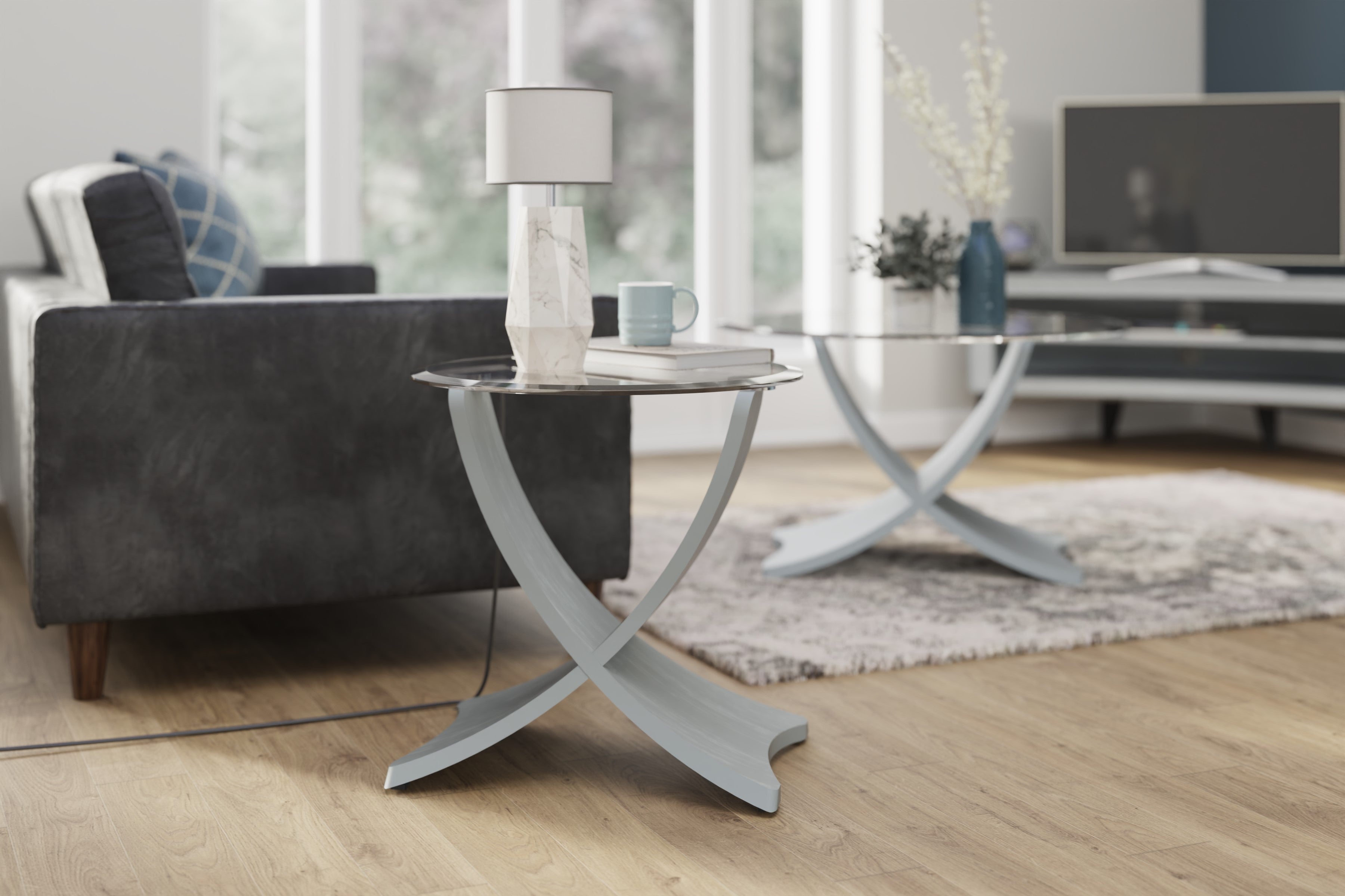 The JF309 Siena Lamp Table is both stylish and sophisticated making it the ideal addition to any home. The clear toughened glass top has a bevelled edge and sits neatly on the sweeping grey veneered legs.  The contrast between the contemporary clear glass, stylish grey legs and modern chrome discs makes for a truly amazing finish. This product is ideally purchased with the matching JF308 Siena Coffee Table.